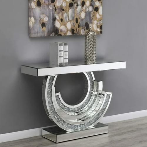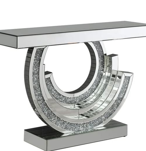 Elevate your entryway with the Celestial C Console Table, a perfect blend of elegance and modern design, featuring a radiant silver finish and unique mirrored details.